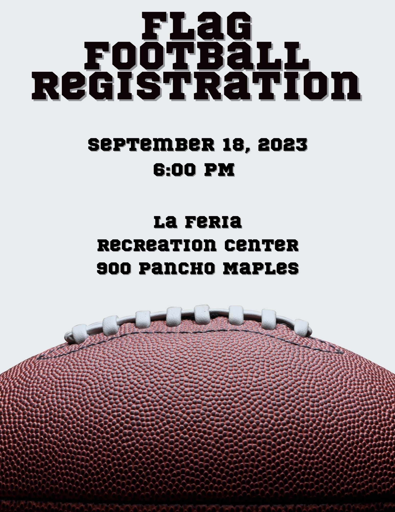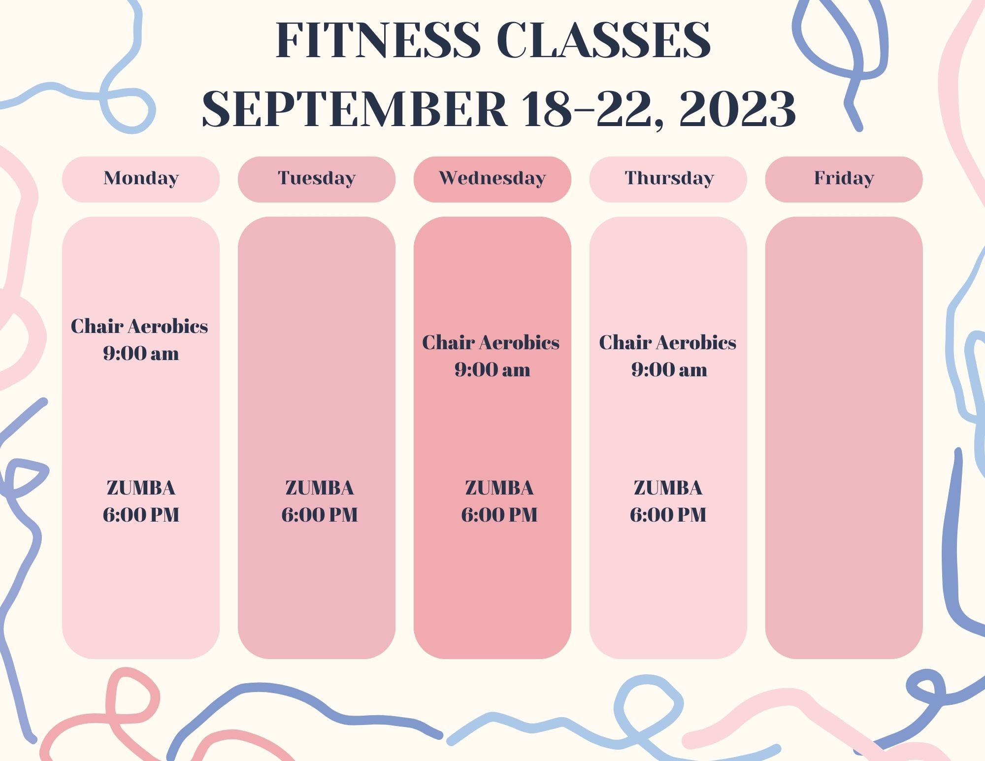 18 * Chair AerobicsChair Aerobics Time: 9:00 am * Flag Football RegistrationFlag Football Registration Time: 4:00 pm * ZumbaZumba Time: 6:00 pm |